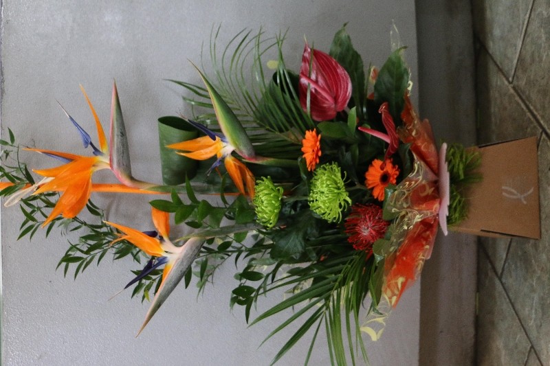 A vibrant mix of tropical flowers and vibrant colours, arranged into a decorative box.