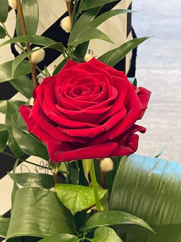 A single luxury 'Naomi' rose, arranged in a slim, black vase with a selection of foliages and placed in a striped, decorate gift-bag for presentation.