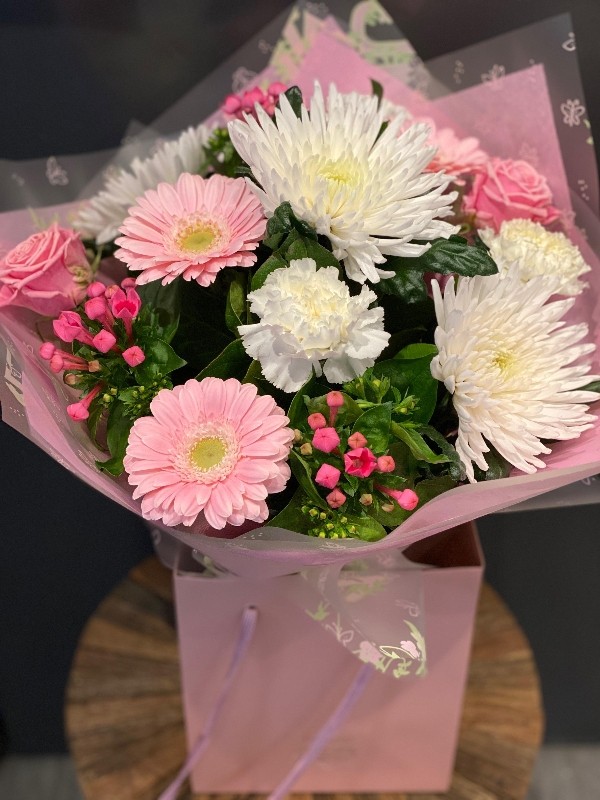 An attractive pink and white aqua pack bouquet. Pink Germinis, Roses and Bouvardia sit perfectly amongst white Chrysanthemums and Carnations.