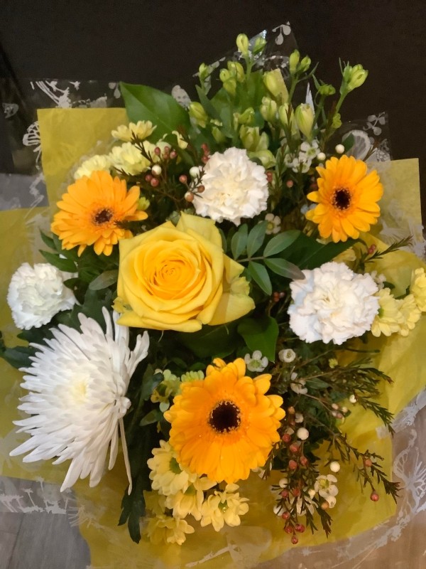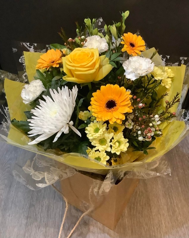 A bright and sunny mix of lemon and cream flowers, arranged in water and presented in a decorative gift bag.