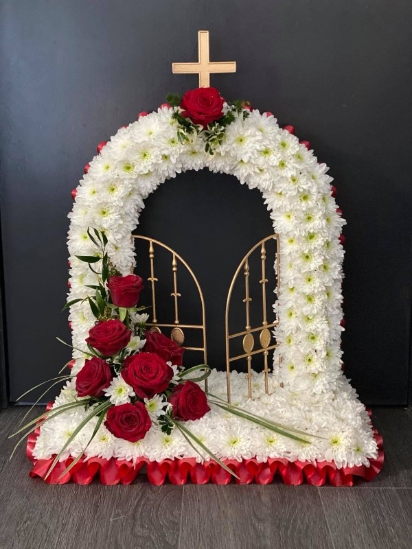 A white Chrysanthemum base 'Gates of Heaven' tribute with a Floral spray in any colour combination.