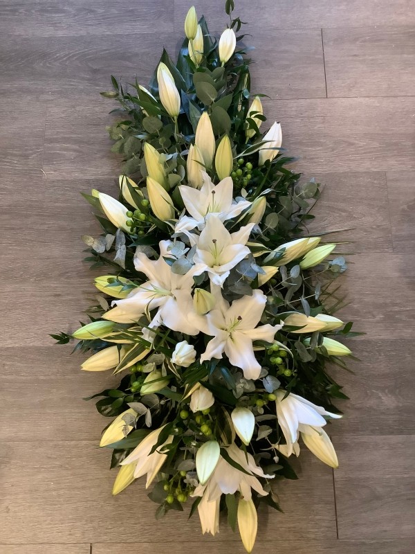 A beautiful combination of white or pink lilies alongside seasonal foliage, arranged in a teardrop shape.