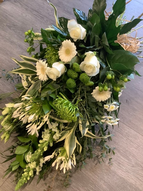 A combination of neutral, country flowers in ivory, arranged in a loose sheaf and tied with raffia.
