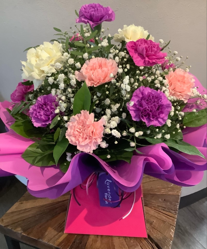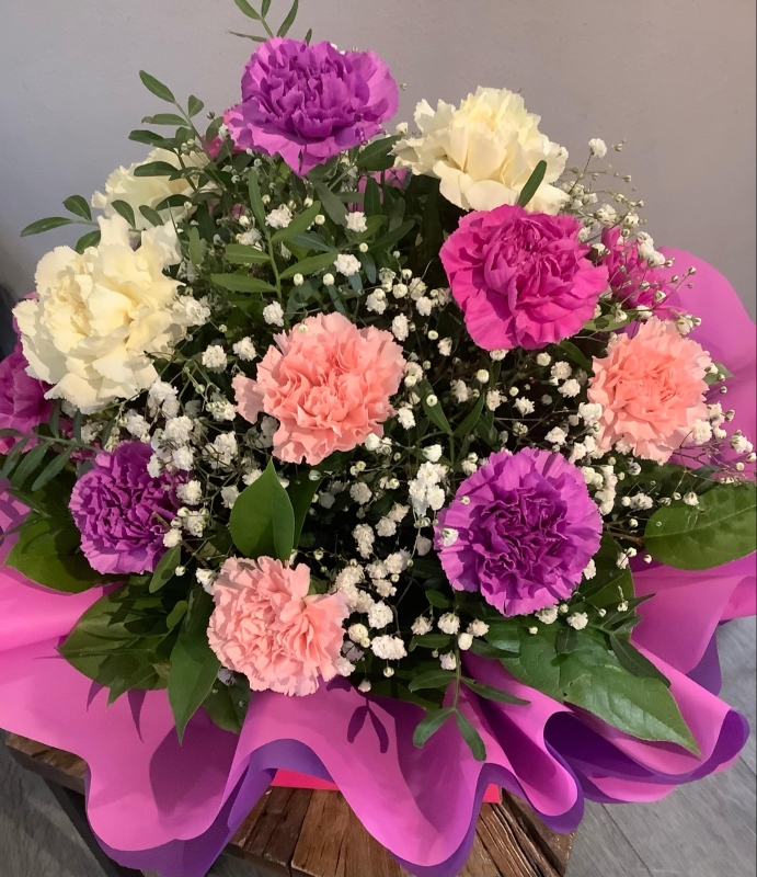 A pretty mix of pastel carnations with gypsophila and foliage. Long-lasting and a true classic.