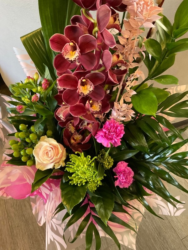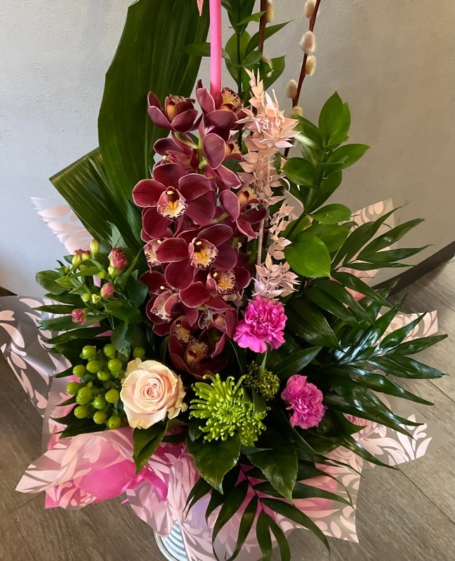 A modern front-facing design, including a lavish orchid, arranged in oasis.