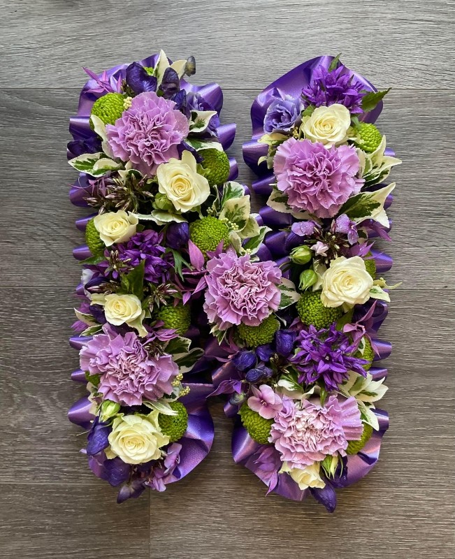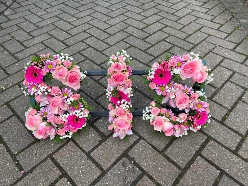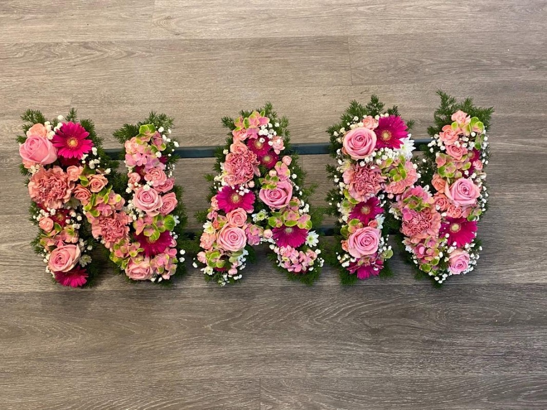 A combination of choice flower in a colour scheme of your choice to create a name or word.
