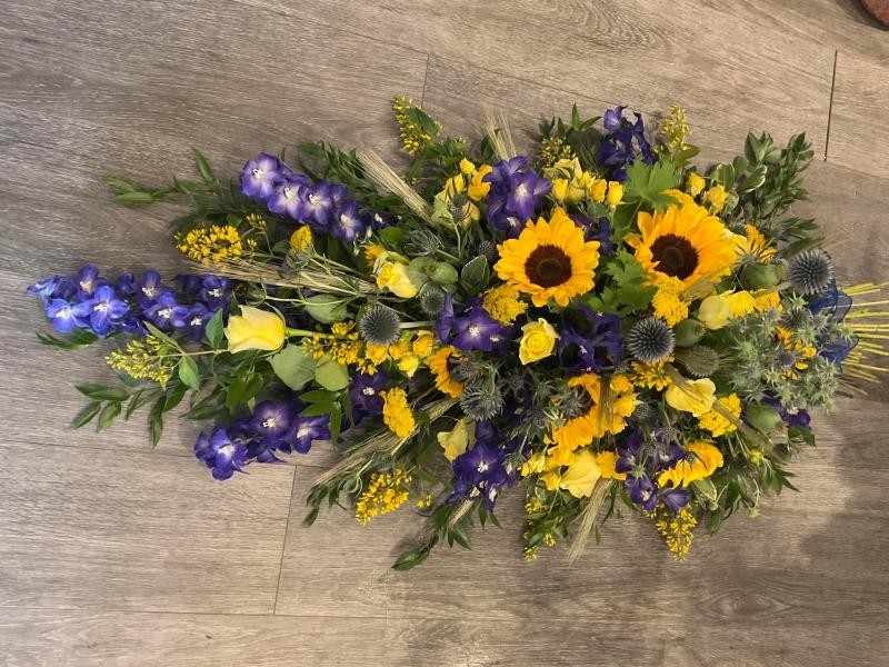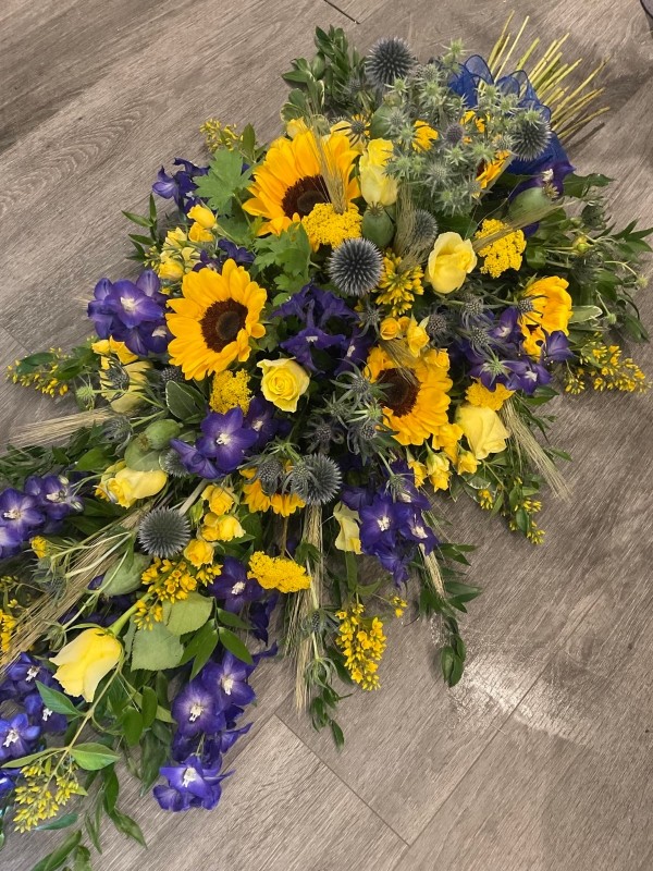 Sunflower spray,  in golds and blues made to look like a tied sheaf with false stems at the end.