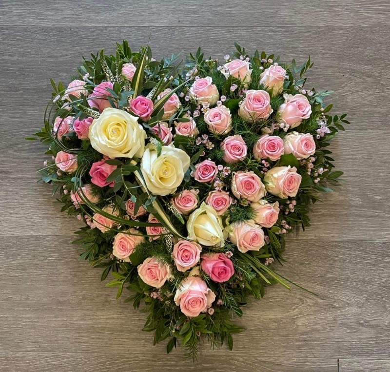 A heart filled with pink roses , with a roses cluster in ivory roses .